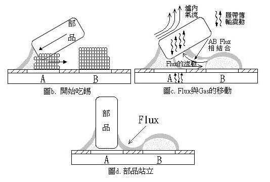 SMT片式元件在遭受急速加熱情況下發(fā)生的翹立,這是因?yàn)榧睙崾乖啥舜嬖跍夭睿姸诉叺暮噶贤耆廴诤螳@得良好的濕潤(rùn),而另邊的焊料未完全熔融而引起濕潤(rùn)不良,這樣促進(jìn)了元件的翹立。因此,回流焊加熱時(shí)要從時(shí)間要素的角度考慮,使水平方向的加熱形成均衡的溫度分布,避免急熱的產(chǎn)生。